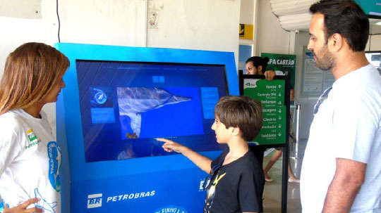 Por meio de texto, imagem e vídeo, o equipamento interativo informa sobre os hábitos de diversas espécies marinhas, entre elas, o golfinho-rotador (Foto/Divulgação)