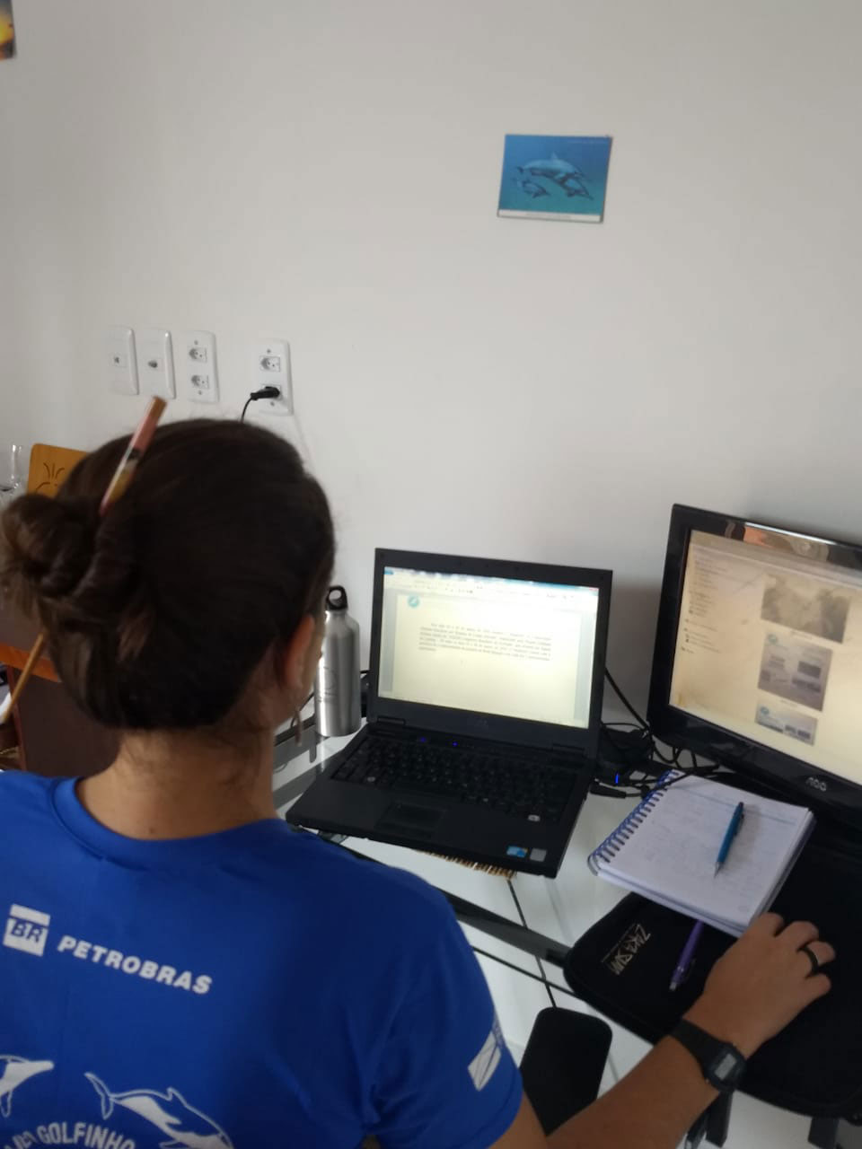 Em casa, usando computador, os pesquisadores estão processando dados coletados anteriormente. São estatísticas de informações obtidas a partir de observações feitas de barcos e também dos dois pontos fixos de monitoramento: Mirante dos Golfinhos e Forte de Nossa Senhora dos Remédios.