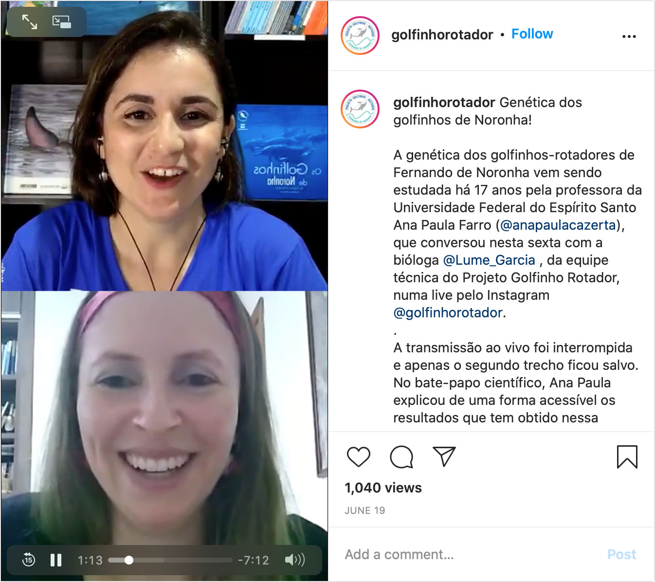 7ª) 19 de junho – Genética dos golfinhos de Noronha (apenas o encerramento da live foi salvo pelo Instagram)