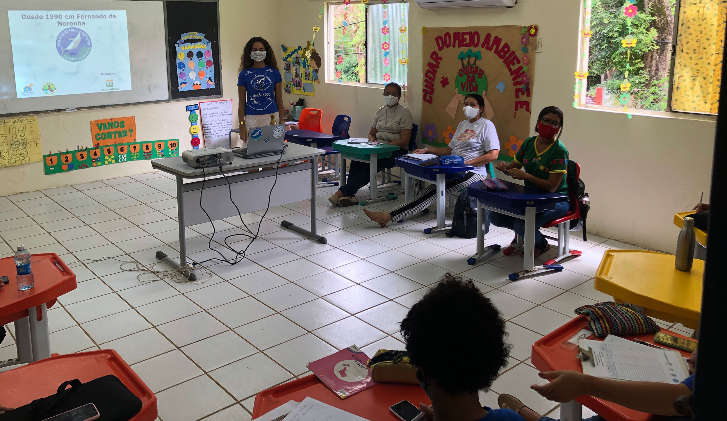 Assim, durante toda aquela semana, o PGR desenvolveu ações voltadas à leitura e à capacitação dos docentes. Na terça-feira (20), ocorreu a primeira oficina de formação deste ano com os professores do Centro Integrado Bem-Me-Quer, com o objetivo de motivar os professores que enfrentam dificuldades no dia a dia, especialmente durante a pandemia do coronavírus. Na atividade, foi utilizada a neurolinguística e a dinâmica com analogias entre o comportamento do golfinho, do tubarão e da carpa e dos seres humanos. “Esses animais têm uma simbologia forte. Nós comparamos a estratégia dos animais para o comportamento evolutivo”, disse a coordenadora de Educação e Comunicação Ambiental do Projeto Golfinho Rotador, Cynthia Gerling.
