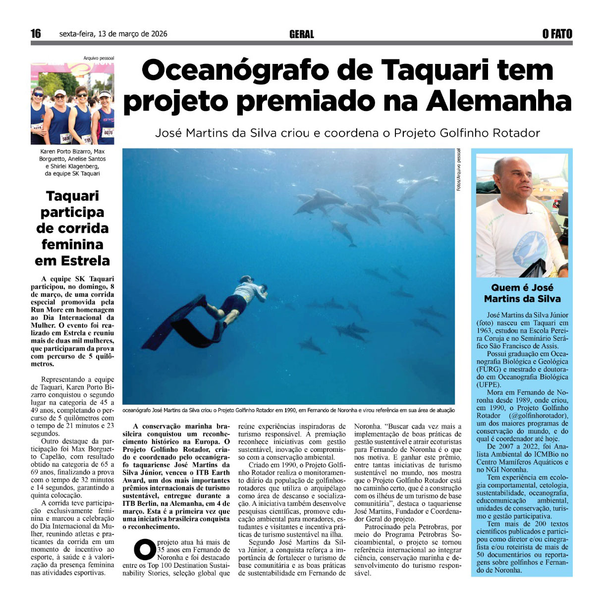A conservação marinha brasileira conquistou um reconhecimento histórico na Europa. O Projeto Golfinho Rotador, criado e coordenado pelo oceanografo taquariense José Martins da Silva Júnior, venceu o ITB Earth Award, um dos mais importantes prêmios internacionais de turismo sustentável, entregue durante a ITB Berlin, na Alemanha, em 4 de março. Esta é a primeira vez que uma iniciativa brasileira conquista o reconhecimento.