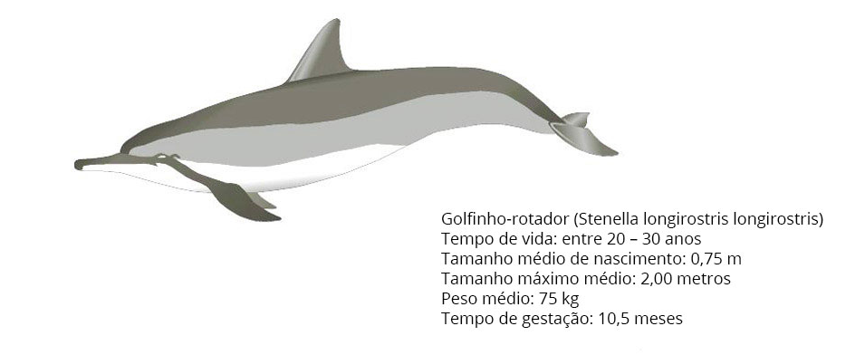 O golfinho-rotador é conhecido cientificamente como “Stenella” por ter o corpo alongado e “longirostris” por ter o focinho (rostro) longo. O nome popular de golfinho-rotador (“spinner dolphin”) é em função de seu comportamento de saltar fora d`água e realizar até sete rotações em torno do próprio eixo.