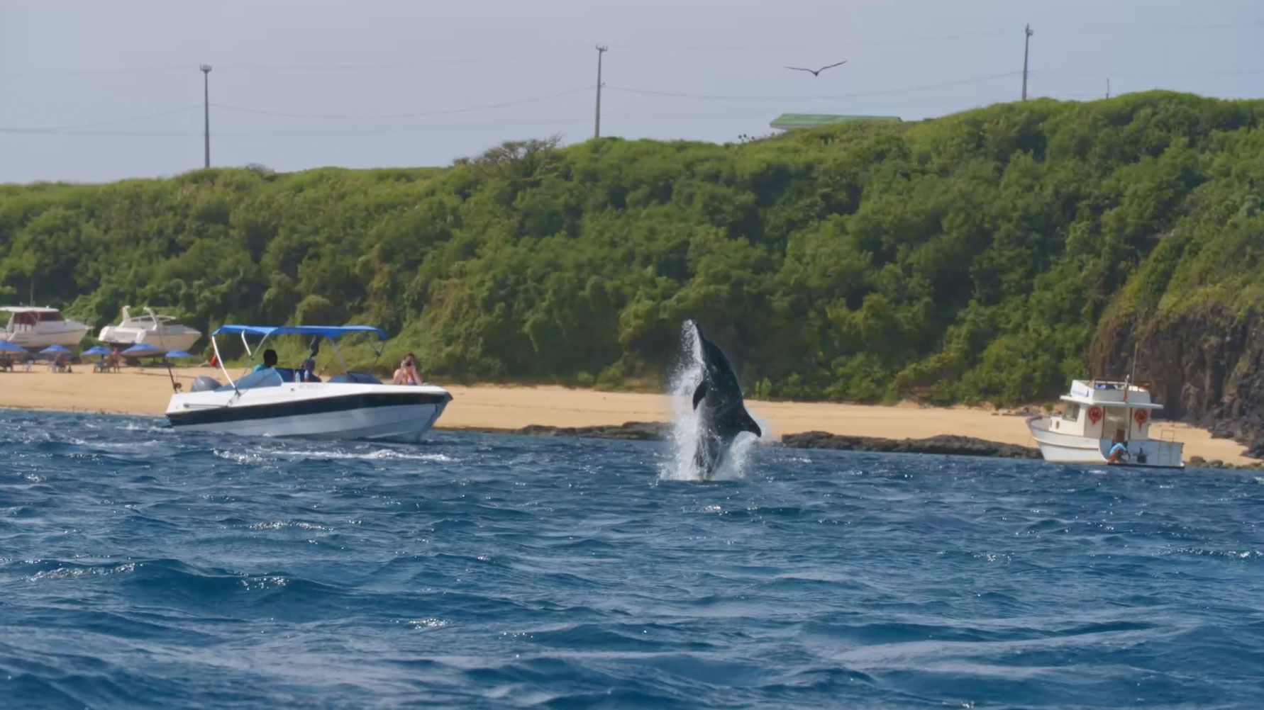 Os mesmo dados mostram que 66% do tempo em que os golfinhos-rotadores permaneceram na área, haviam embarcações interagindo com os grupos.