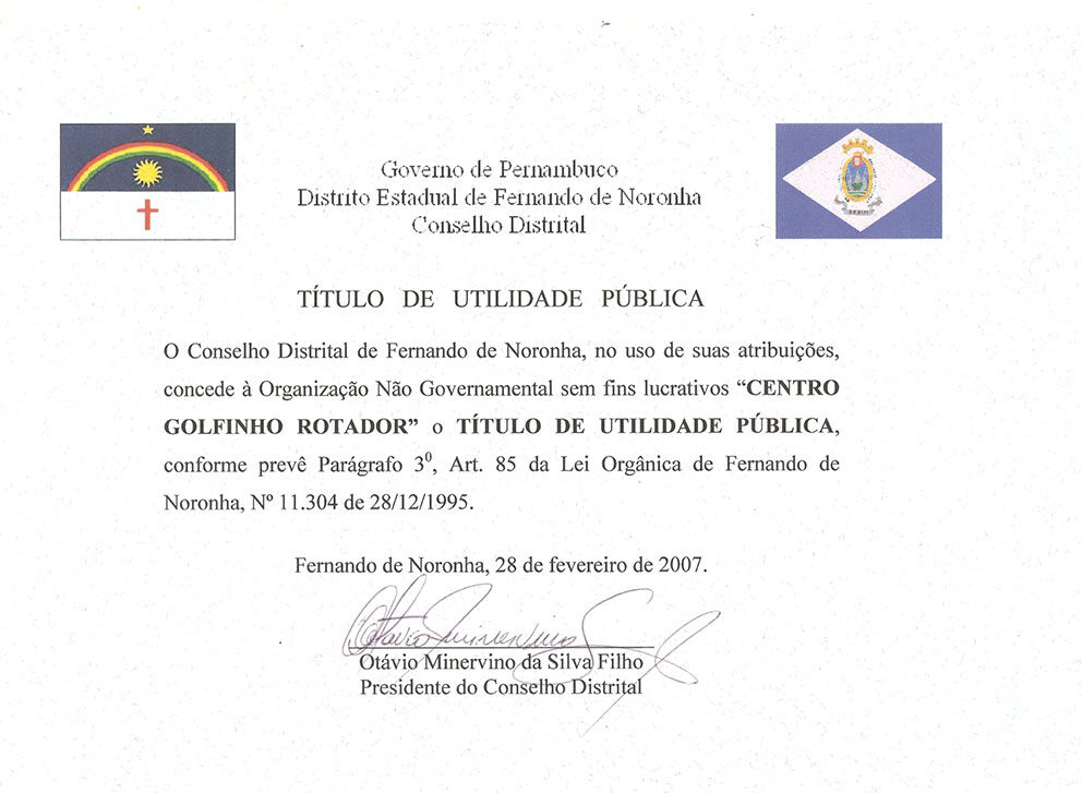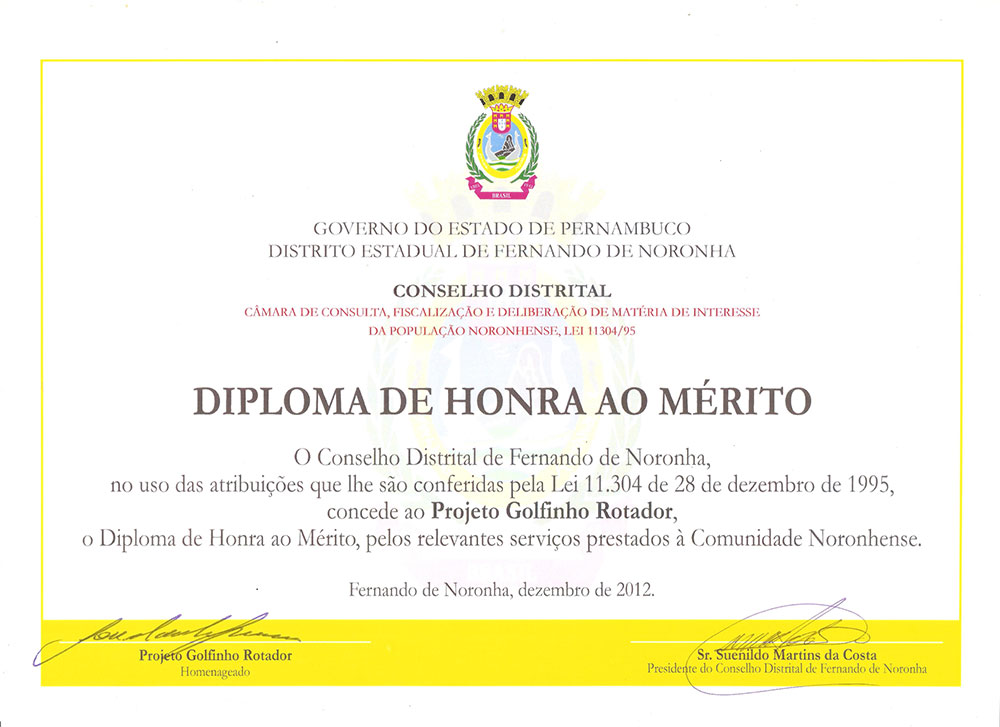 Em 2012 e 2013 o Projeto Golfinho Rotador foi contemplado com esse Diploma de Honra ao Mérito em virtude de suas ações locais que beneficiaram: os alunos da Escola Arquipélago na temática Educação Ambiental; jovens que receberam cursos profissionalizantes na área do Ecoturismo; e, ao Projeto de Sustentabilidade, que contemplou 75 Pousadas em Fernando de Noronha, no âmbito de como implementar uma Gestão Sustentável nos Meios de Hospedagem de Fernando de Noronha.